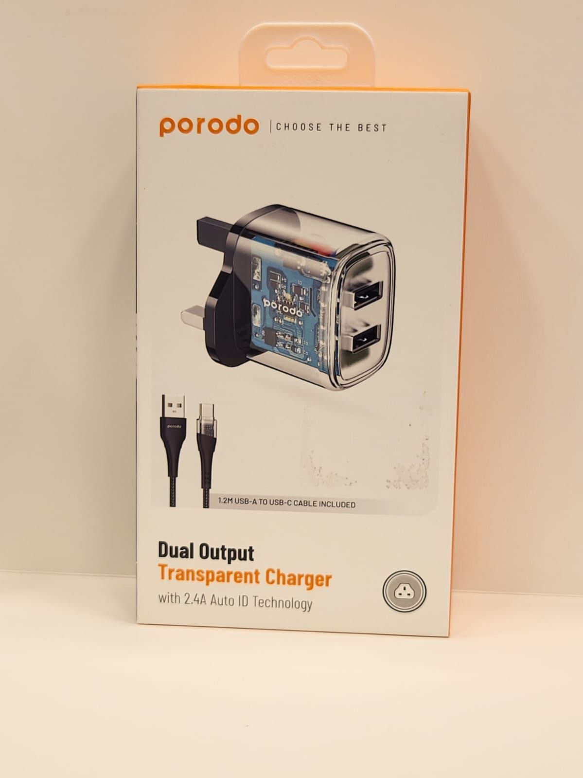 Porodo Dual Output Transparent Charger is a sleek and efficient charging solution designed to power up your devices quickly and safely. Its transparent casing not only offers a modern aesthetic but also allows you to view the internal components.